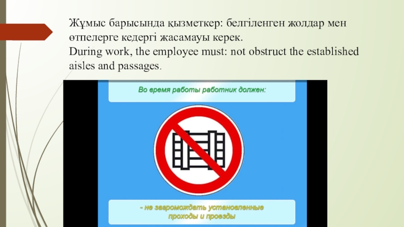 Слайд 5Жұмыс барысында қызметкер: белгіленген жолдар мен өтпелерге кедергі жасамауы керек.