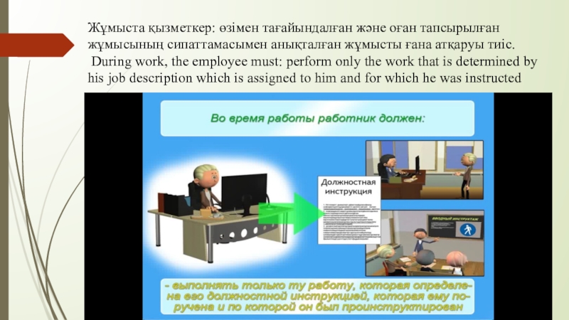 Жұмыста қызметкер: өзімен тағайындалған және оған тапсырылған жұмысының сипаттамасымен анықталған жұмысты ғана атқаруы тиіс. During work, the