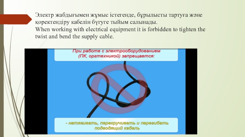 Слайд 7Электр жабдығымен жұмыс істегенде, бұрылысты тартуға және қоректендіру кабелін бүгуге тыйым