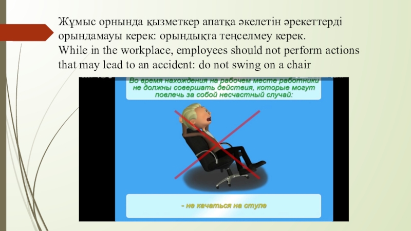 Слайд 4Жұмыс орнында қызметкер апатқа әкелетін әрекеттерді орындамауы керек: орындықта теңселмеу керек.