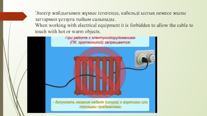 Слайд 6Электр жабдығымен жұмыс істегенде, кабельді ыстық немесе жылы заттармен ұстауға тыйым