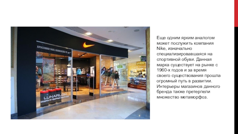 спортивной обуви. Данная марка существует на рынке с 1960-х годов и за время своего существования прошла огромный путь в развитии. Интерьеры магазинов данного бренда также претерпели множество метаморфоз.