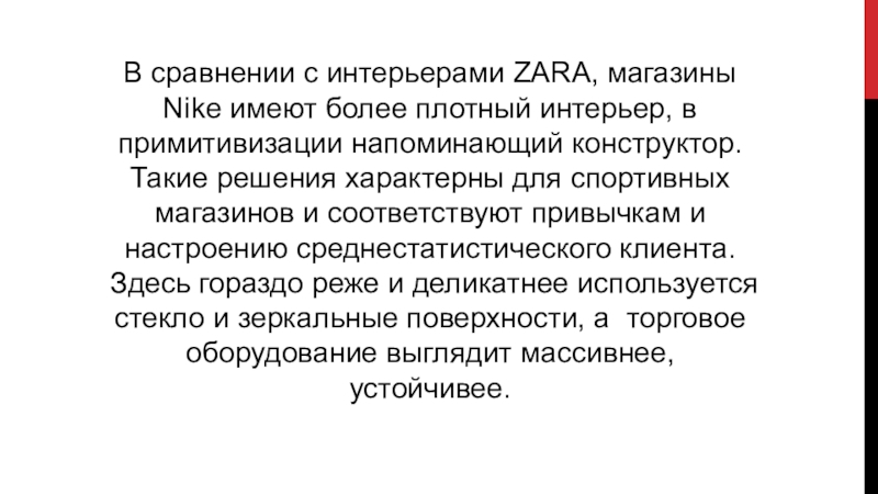 Слайд 15В сравнении с интерьерами ZARA, магазины Nike имеют более плотный интерьер,