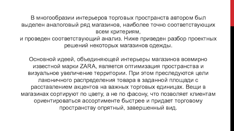 Основной идеей, объединяющей интерьеры магазинов всемирно известной марки ZARA, является оптимизация пространства и визуальное увеличение территории. При этом преследуются цели лаконичного распределения товара в заданной площади с расставлением акцентов на важных торговых единицах. Вещи в магазинах сортируют по цвету, а не по фасону, что позволяет клиентам ориентироваться ассортименте быстрее и придает торговому пространству опрятный, завершенный вид.