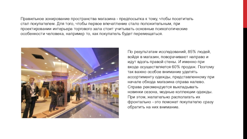 Слайд 6По результатам исследований, 85% людей, войдя в магазин, поворачивают направо и