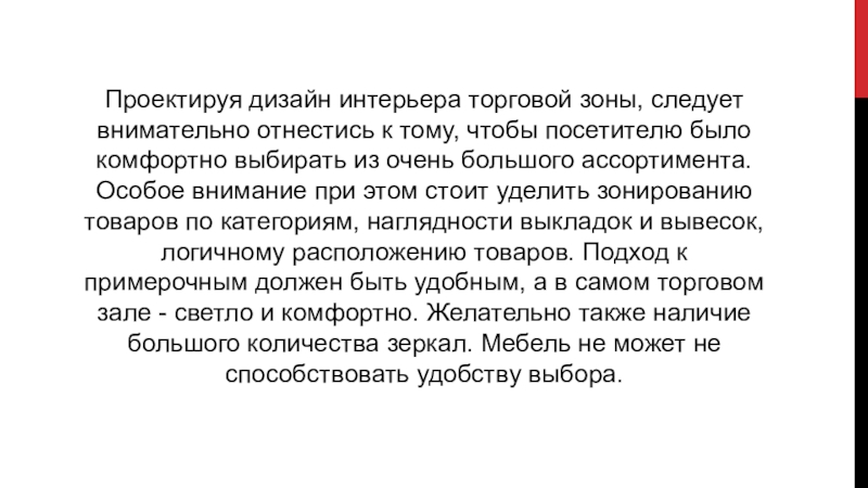 Слайд 7Проектируя дизайн интерьера торговой зоны, следует внимательно отнестись к тому, чтобы