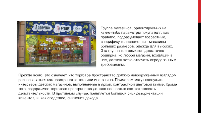Слайд 5Группа магазинов, ориентируемых на какие-либо параметры покупателя, как правило, подразумевает возрастные,