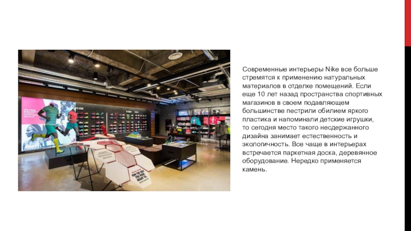 Слайд 14Современные интерьеры Nike все больше стремятся к применению натуральных материалов в