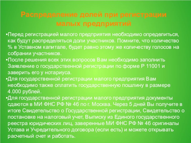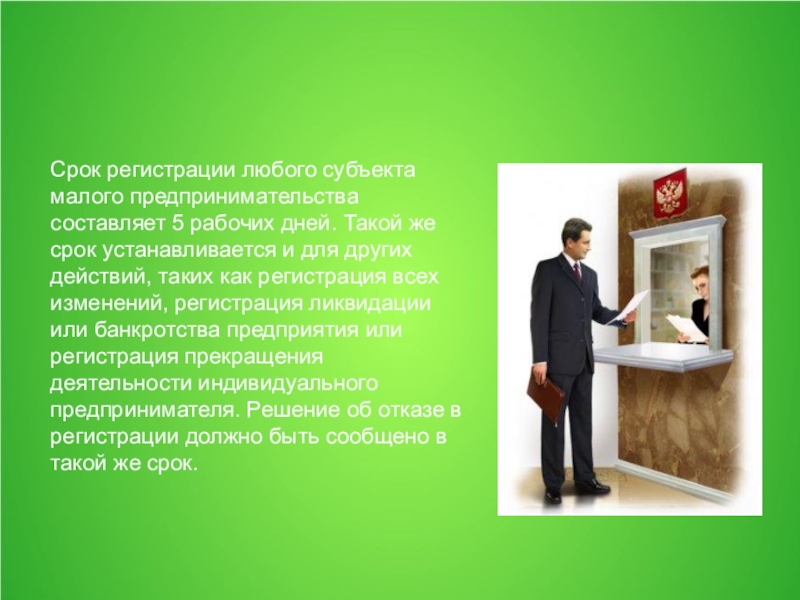 Слайд 8Срок регистрации любого субъекта малого предпринимательства составляет 5 рабочих дней. Такой