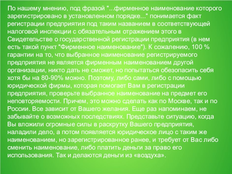 порядке..." понимается факт регистрации предприятия под таким названием в соответствующей налоговой инспекции с обязательным отражением этого в Свидетельстве о государственной регистрации предприятия (в нем есть такой пункт "Фирменное наименование"). К сожалению, 100 % гарантии на то, что выбранное наименование регистрируемого предприятия не является фирменным наименованием другой организации, никто дать не сможет, но попытаться обезопасить себя хотя бы на 80-90% можно. Поэтому, либо сами, либо с помощью юридической фирмы, которая помогает Вам в регистрации предприятия, проверьте выбранное наименование на предмет его неповторяемости. Причем, это можно сделать как по Москве, так и по России. Все зависит от Вашего желания. Еще раз напоминаем, не забывайте о возможных последствиях. Представьте ситуацию, когда Вы вложили огромные силы в раскрутку Вашего предприятия, наладили дело, а потом появляется юридическое лицо с таким же наименованием, но зарегистрированное ранее, и требует от Вас либо сменить наименование, либо платить деньги за право его использования. Так и делаются деньги из «воздуха».