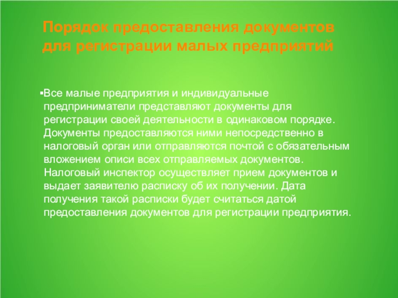 Слайд 7Порядок предоставления документов для регистрации малых предприятий