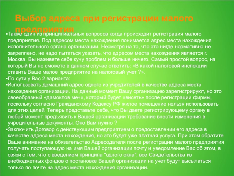 Использовать домашний адрес одного из учредителей в качестве адреса места нахождения организации. На данный момент Вашу организацию зарегистрируют, но это своеобразный «дамоклов меч», который будет «висеть» после регистрации фирмы, поскольку согласно Гражданскому Кодексу РФ жилое помещение нельзя использовать для этих целей. Теперь представьте себе, что Вы даете регистрирующему органу в любой момент предъявить к Вашей организации требование внести изменения в учредительные документы. Оно Вам нужно ?