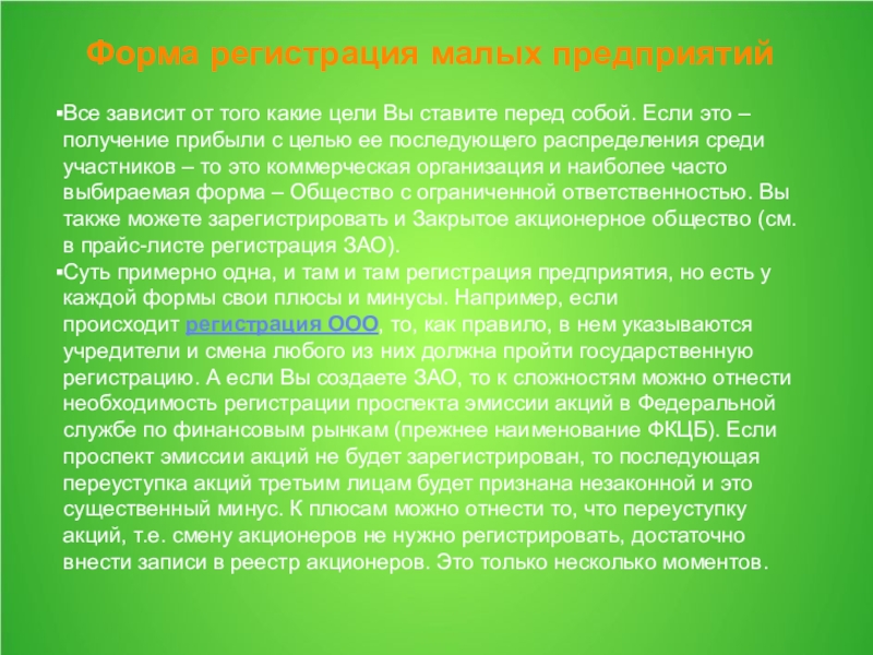 перед собой. Если это – получение прибыли с целью ее последующего распределения среди участников – то это коммерческая организация и наиболее часто выбираемая форма – Общество с ограниченной ответственностью. Вы также можете зарегистрировать и Закрытое акционерное общество (см. в прайс-листе регистрация ЗАО).