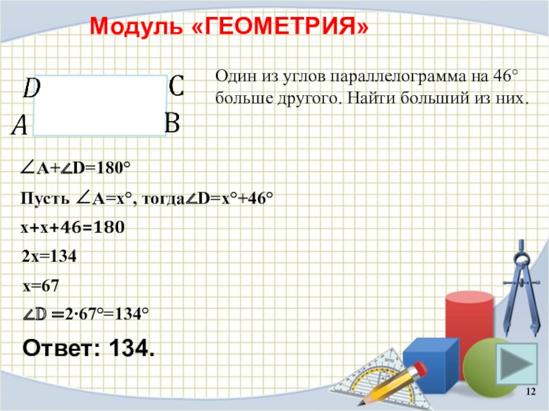 Пусть ∠А=х°, тогда∠D=х°+46°