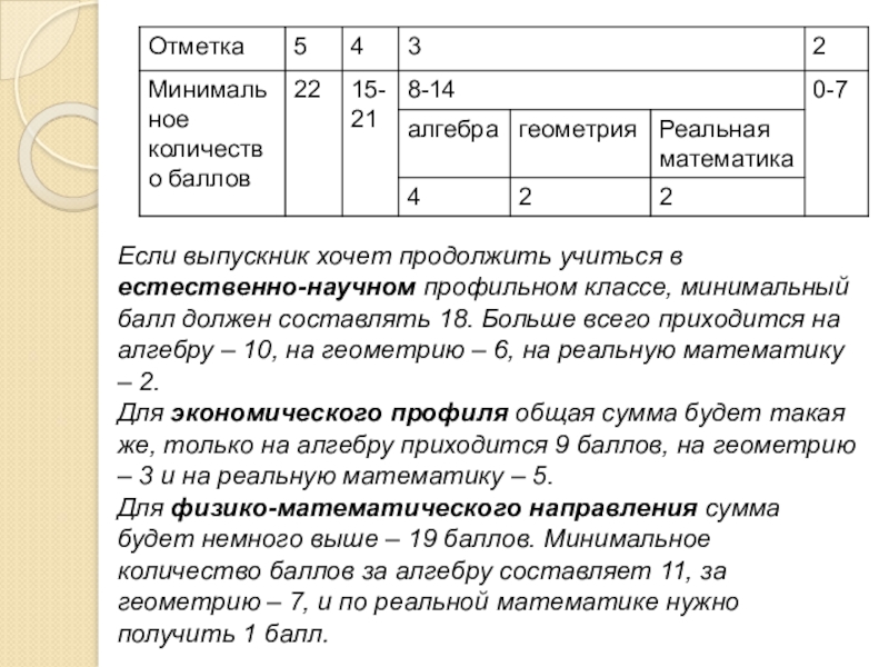 Для экономического профиля общая сумма будет такая же, только на алгебру приходится 9 баллов, на геометрию – 3 и на реальную математику – 5.