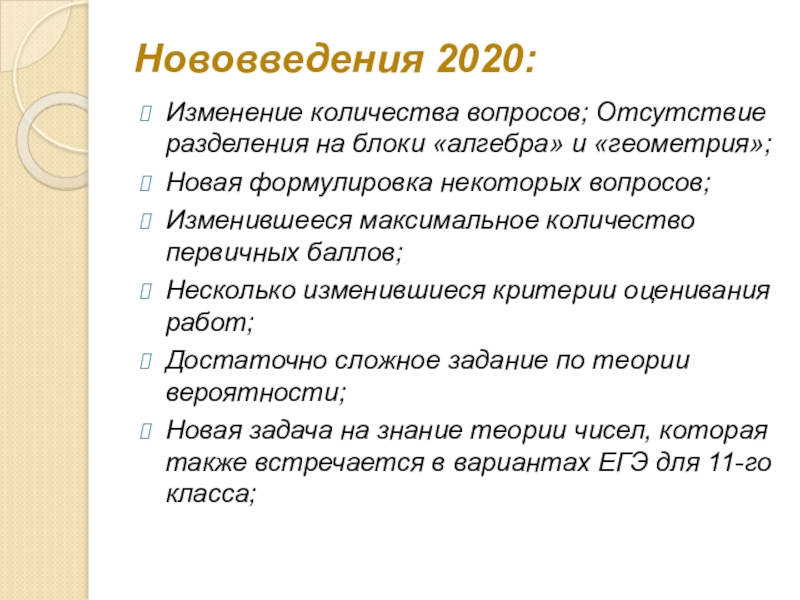 Изменение количества вопросов; Отсутствие разделения на блоки «алгебра» и «геометрия»;
