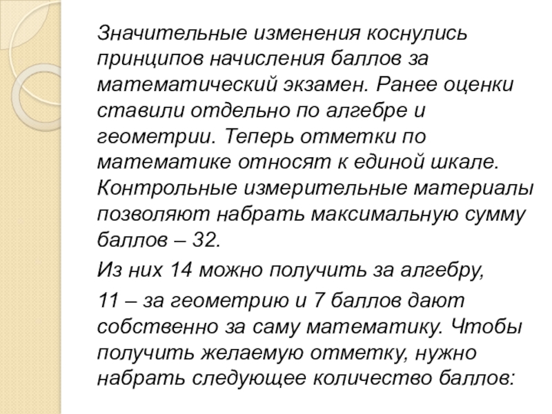 Значительные изменения коснулись принципов начисления баллов за математический экзамен. Ранее оценки
