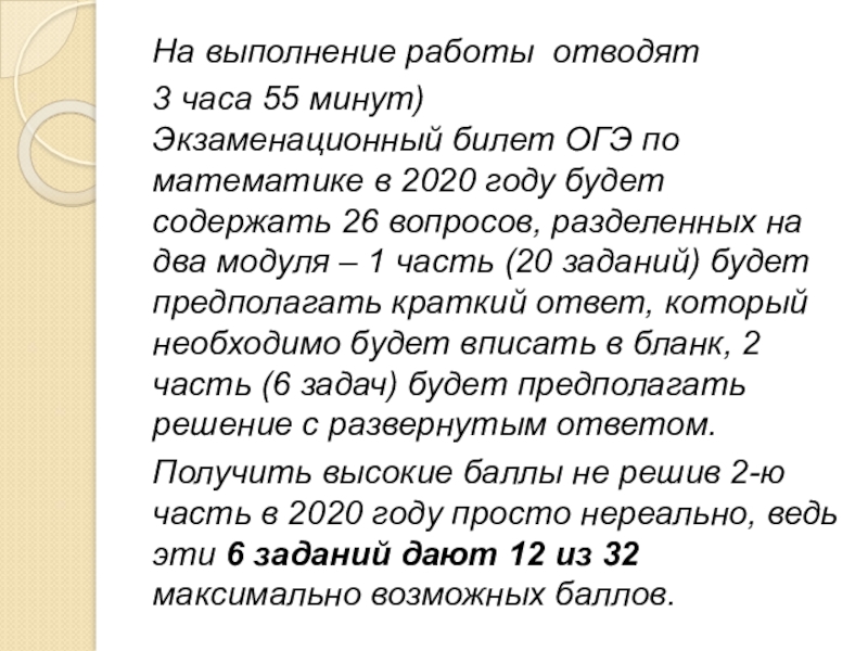 математике в 2020 году будет содержать 26 вопросов, разделенных на два модуля – 1 часть (20 заданий) будет предполагать краткий ответ, который необходимо будет вписать в бланк, 2 часть (6 задач) будет предполагать решение с развернутым ответом.