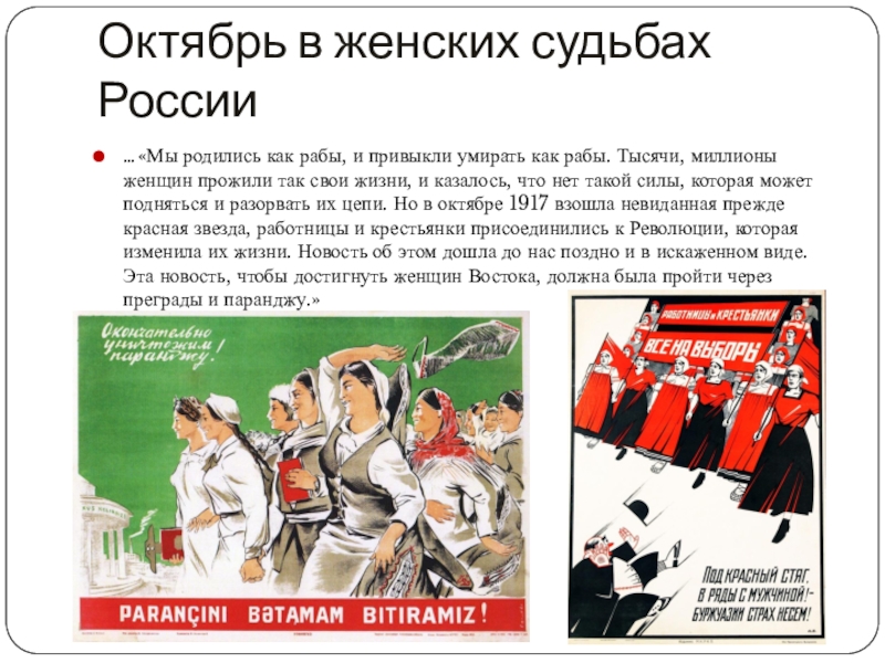 как рабы. Тысячи, миллионы женщин прожили так свои жизни, и казалось, что нет такой силы, которая может подняться и разорвать их цепи. Но в октябре 1917 взошла невиданная прежде красная звезда, работницы и крестьянки присоединились к Революции, которая изменила их жизни. Новость об этом дошла до нас поздно и в искаженном виде. Эта новость, чтобы достигнуть женщин Востока, должна была пройти через преграды и паранджу.»