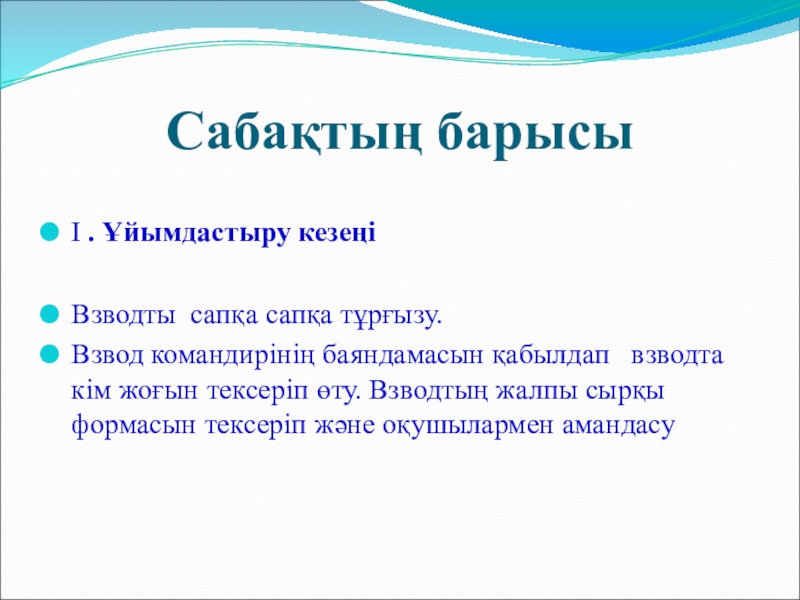 взводта кім жоғын тексеріп өту. Взводтың жалпы сырқы формасын тексеріп және оқушылармен амандасу