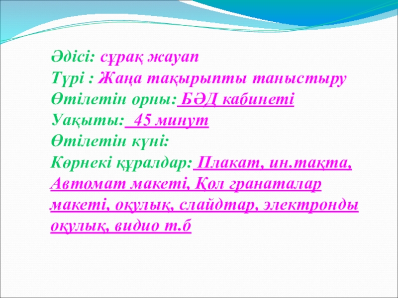 Көрнекі құралдар: Плакат, ин.тақта, Автомат макеті, Қол гранаталар макеті, оқулық, слайдтар, электронды оқулық, видио т.б