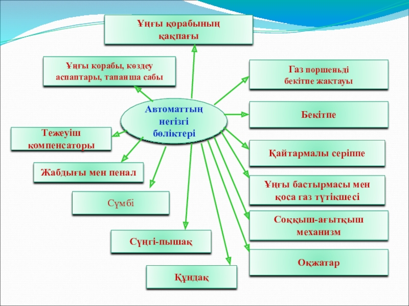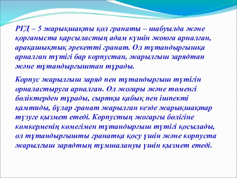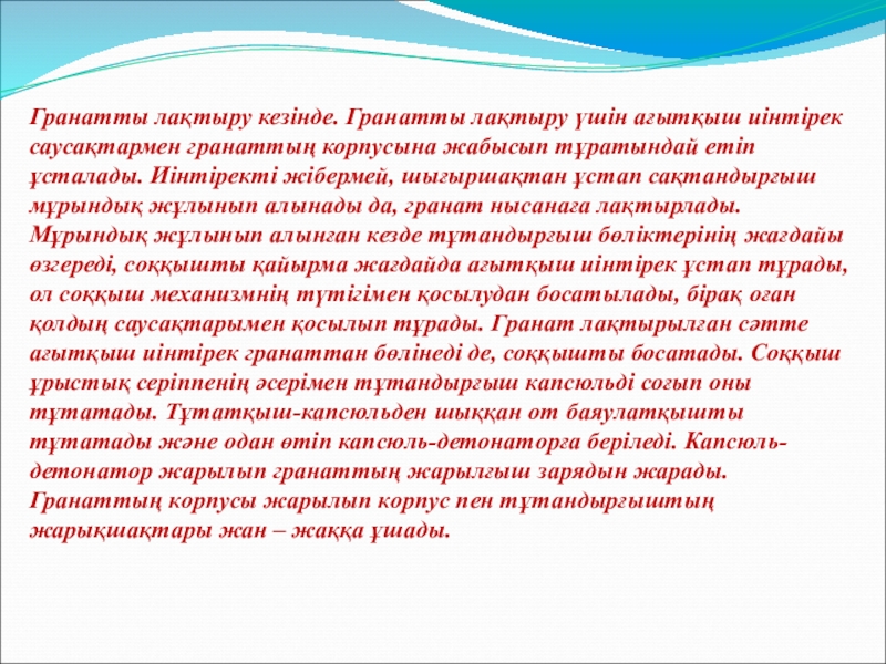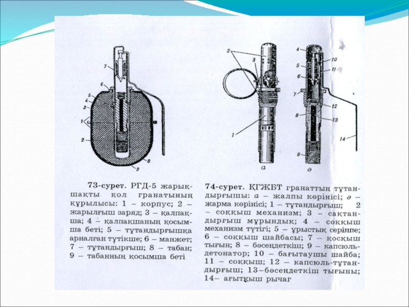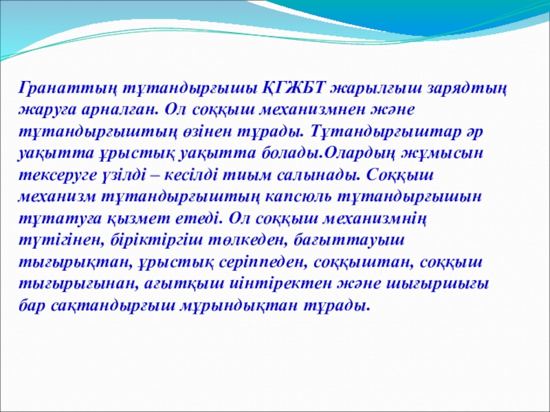 Слайд 14Гранаттың тұтандырғышы ҚГЖБТ жарылғыш зарядтың жаруға арналған. Ол соққыш механизмнен және
