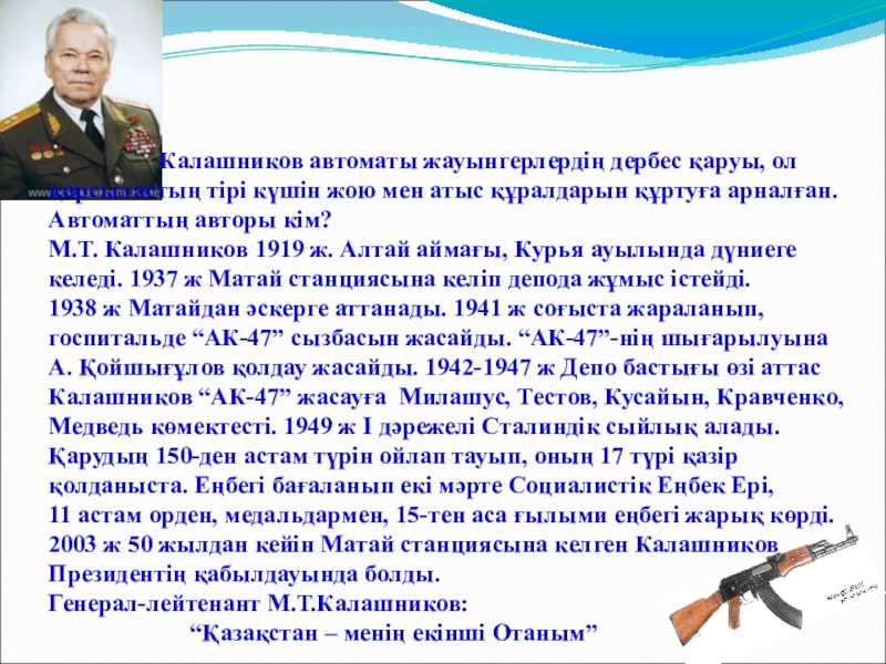 1938 ж Матайдан әскерге аттанады. 1941 ж соғыста жараланып, госпитальде “АК-47” сызбасын жасайды. “АК-47”-нің шығарылуына А. Қойшығұлов қолдау жасайды. 1942-1947 ж Депо бастығы өзі аттас Калашников “АК-47” жасауға Милашус, Тестов, Кусайын, Кравченко, Медведь көмектесті. 1949 ж І дәрежелі Сталиндік сыйлық алады. Қарудың 150-ден астам түрін ойлап тауып, оның 17 түрі қазір қолданыста. Еңбегі бағаланып екі мәрте Социалистік Еңбек Ері,