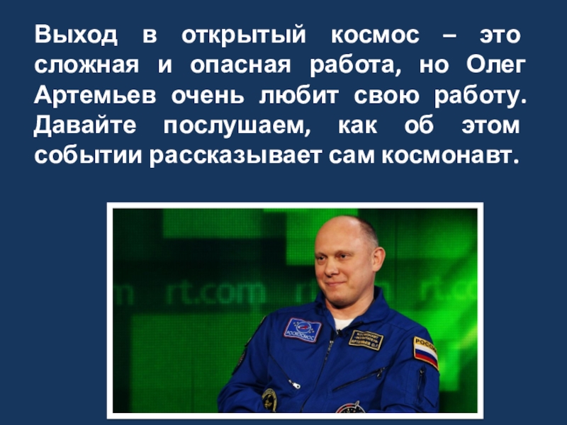 Олег Артемьев очень любит свою работу. Давайте послушаем, как об этом событии рассказывает сам космонавт.