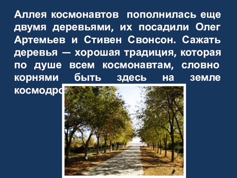 Слайд 18Аллея космонавтов пополнилась еще двумя деревьями, их посадили Олег Артемьев и
