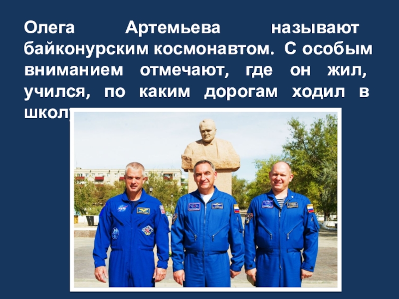 Слайд 20Олега Артемьева называют байконурским космонавтом. С особым вниманием отмечают, где он
