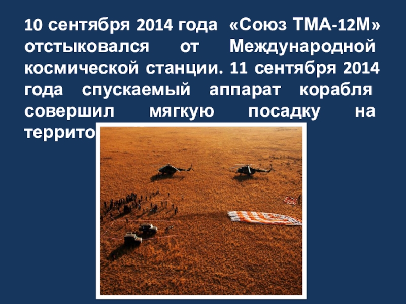 Слайд 1610 сентября 2014 года «Союз ТМА-12М» отстыковался от Международной космической станции.