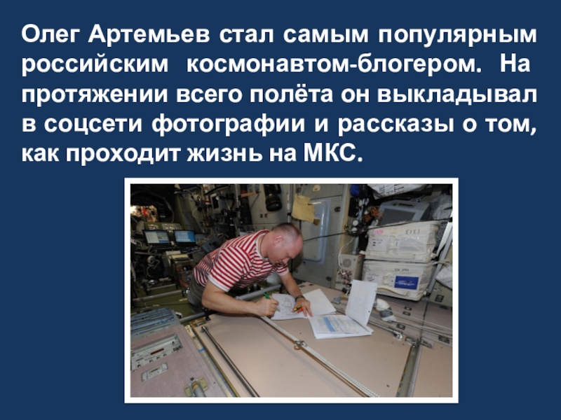 Слайд 10Олег Артемьев стал самым популярным российским космонавтом-блогером. На протяжении всего полёта