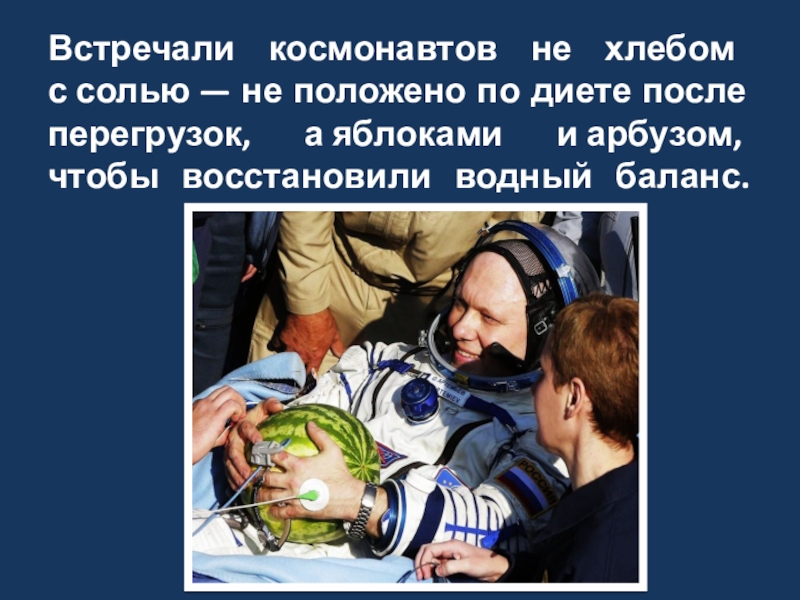 Слайд 17Встречали космонавтов не хлебом с солью — не положено по диете после перегрузок,