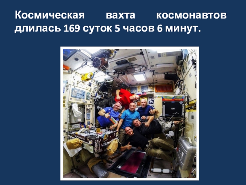 Слайд 8Космическая вахта космонавтов длилась 169 суток 5 часов 6 минут.