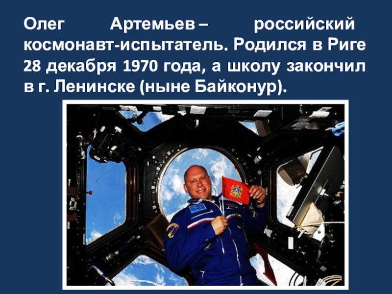 Слайд 2Олег Артемьев – российский космонавт-испытатель. Родился в Риге 28 декабря 1970 года,