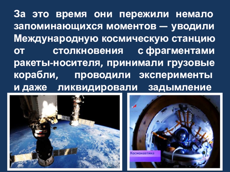 станцию от столкновения с фрагментами ракеты-носителя, принимали грузовые корабли, проводили эксперименты и даже ликвидировали задымление в отсеке МКС.