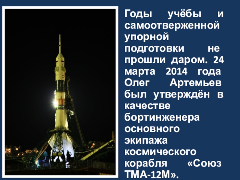 2014 года Олег Артемьев был утверждён в качестве бортинженера основного экипажа космического корабля «Союз ТМА-12М».
