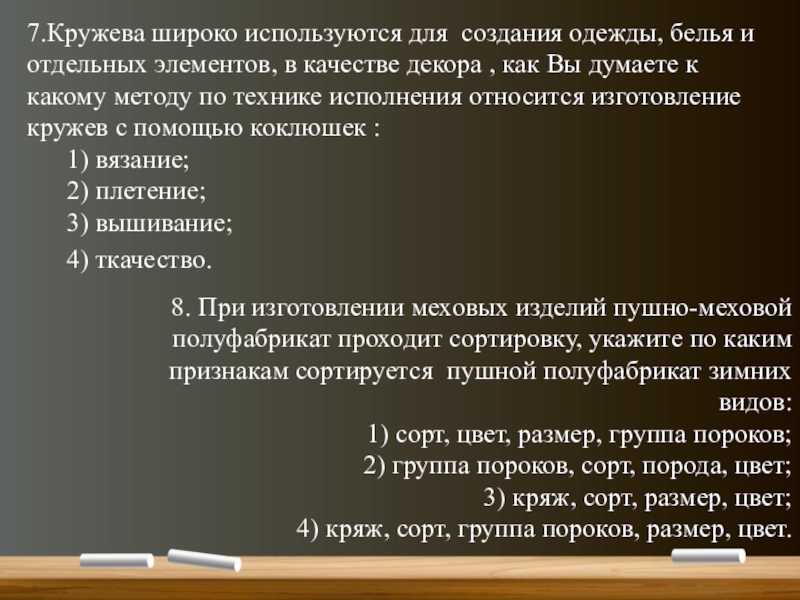 8. При изготовлении меховых изделий пушно-меховой полуфабрикат проходит сортировку, укажите по каким признакам сортируется пушной полуфабрикат зимних видов: