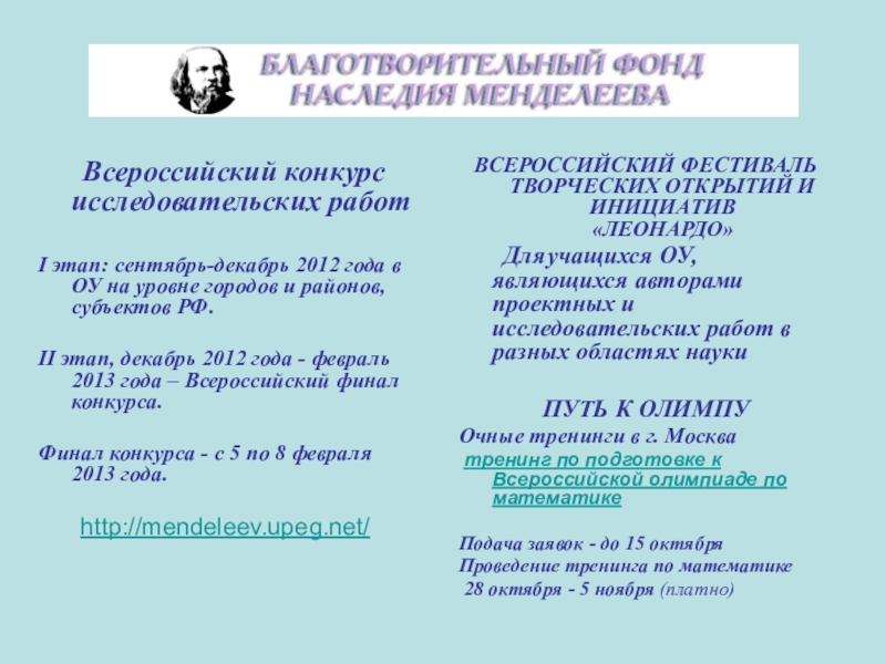 Для учащихся ОУ, являющихся авторами проектных и исследовательских работ в разных областях науки
