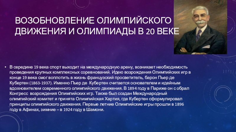 проведения крупных комплексных соревнований. Идею возрождения Олимпийских игр в конце 19 века смог воплотить в жизнь французский просветитель, барон Пьер де Кубертен (1863-1937). Именно Пьер де Кубертен считается основателем и идейным вдохновителем современного олимпийского движения. В 1894 году в Париже он с обрал Конгресс возрождения Олимпийских игр. Также был создан Международный олимпийский комитет и принята Олимпийская Хартия, где Кубертен сформулировал принципы олимпийского движения. Первые летние Олимпийские игры прошли в 1896 году в Афинах, зимние – в 1924 году в Шамони.