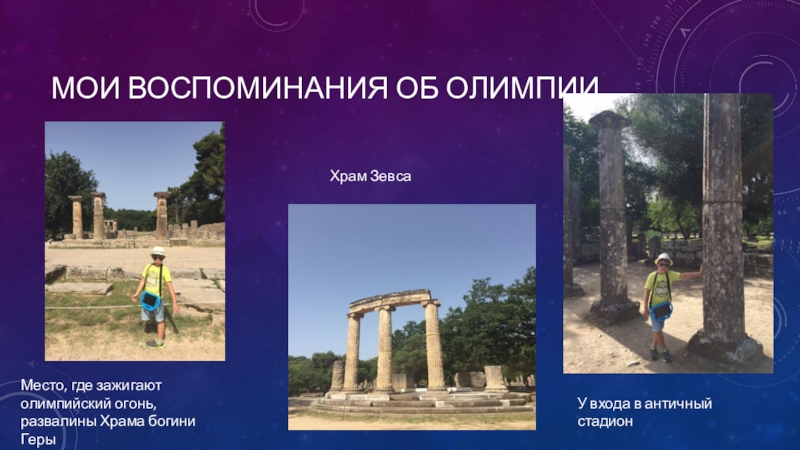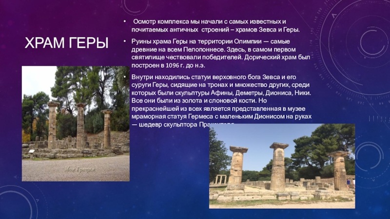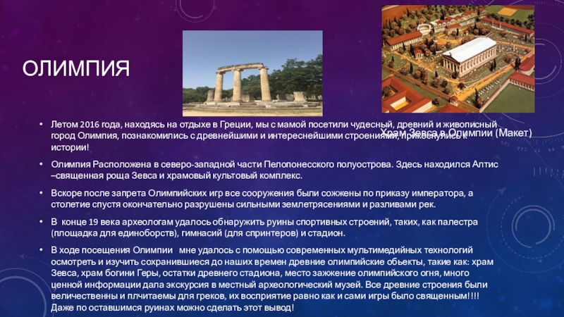 В ходе посещения Олимпии мне удалось с помощью современных мультимедийных технологий осмотреть и изучить сохранившиеся до наших времен древние олимпийские обьекты, такие как: храм Зевса, храм богини Геры, остатки древнего стадиона, место зажжение олимпийского огня, много ценной информации дала экскурсия в местный археологический музей. Все древние строения были величественны и плчитаемы для греков, их восприятие равно как и сами игры было священным!!!! Даже по оставшимся руинах можно сделать этот вывод!