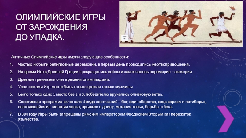 Олимпийские игры – крупнейшие спортивные соревнования древности. Зародились как