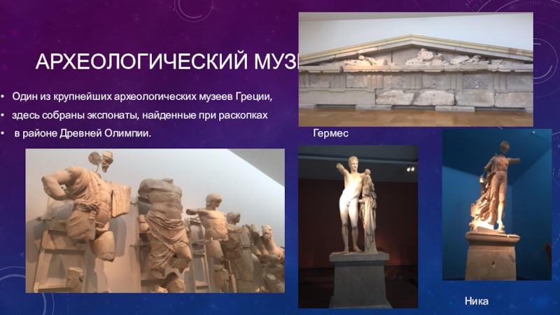 Внутри находились статуи верховного бога Зевса и его суруги Геры, сидящие на тронах и множество других, среди которых были скульптуры Афины, Деметры, Диониса, Ники. Все они были из золота и слоновой кости. Но прекраснейшей из всех является представленная в музее мраморная статуя Гермеса с маленьким Дионисом на руках — шедевр скульптора Праксителя.