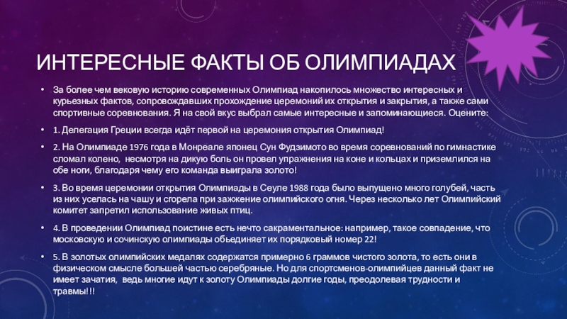 множество интересных и курьезных фактов, сопровождавших прохождение церемоний их открытия и закрытия, а также сами спортивные соревнования. Я на свой вкус выбрал самые интересные и запоминающиеся. Оцените: