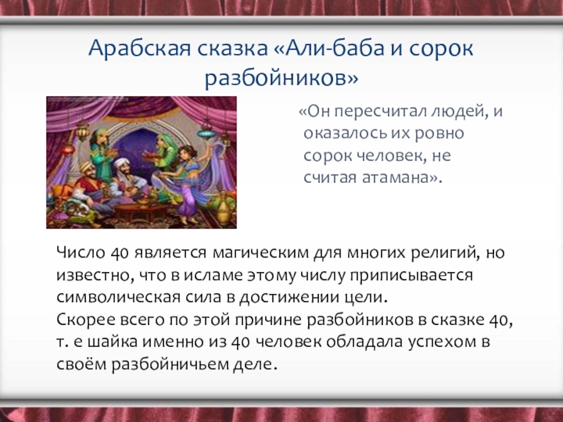 Скорее всего по этой причине разбойников в сказке 40, т. е шайка именно из 40 человек обладала успехом в своём разбойничьем деле.