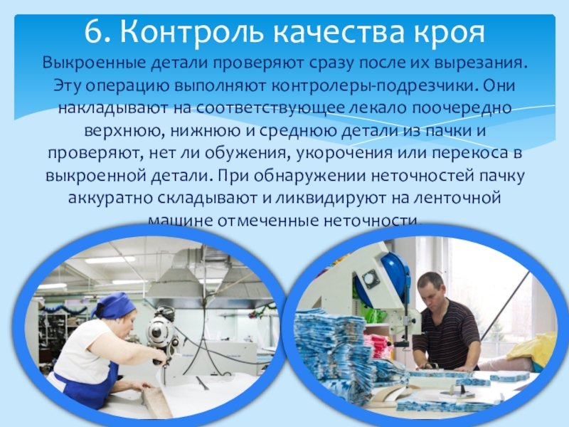 Эту операцию выполняют контролеры-подрезчики. Они накладывают на соответствующее лекало поочередно верхнюю, нижнюю и среднюю детали из пачки и проверяют, нет ли обужения, укорочения или перекоса в выкроенной детали. При обнаружении неточностей пачку аккуратно складывают и ликвидируют на ленточной машине отмеченные неточности.