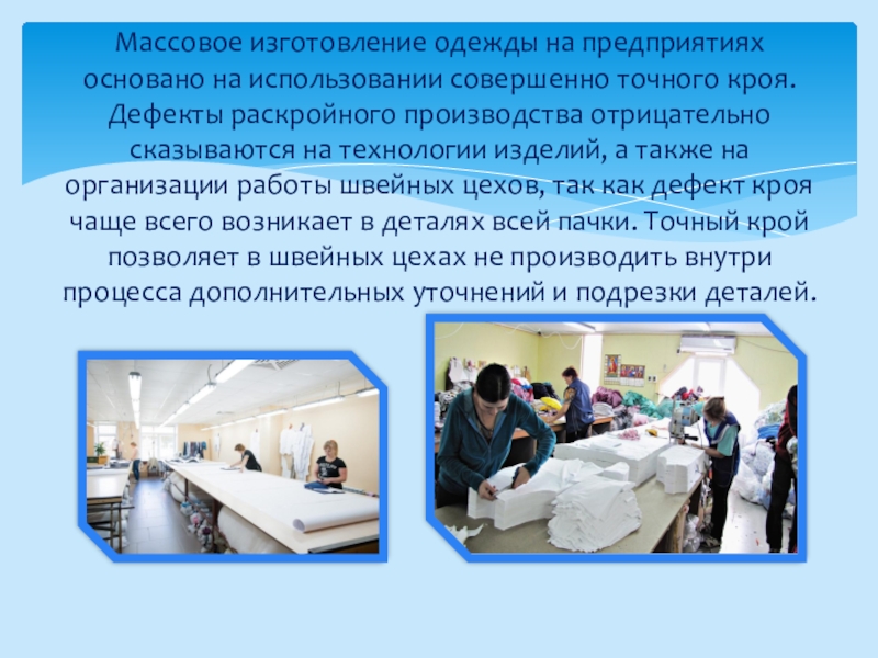 Слайд 24Массовое изготовление одежды на предприятиях основано на использовании совершенно точного кроя.
