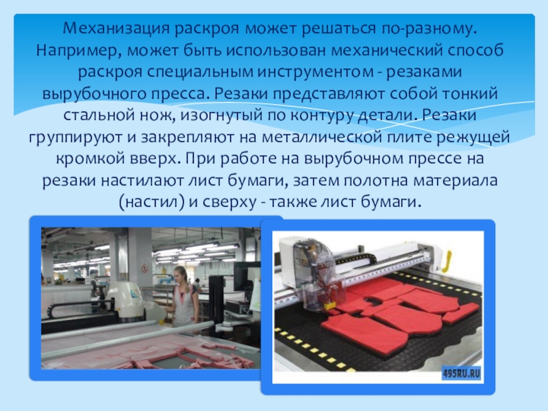 Слайд 27Механизация раскроя может решаться по-разному. Например, может быть использован механический способ
