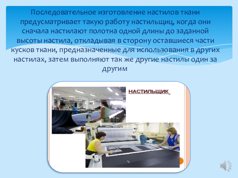 Слайд 14Последовательное изготовление настилов ткани предусматривает такую работу настильщиц, когда они сначала