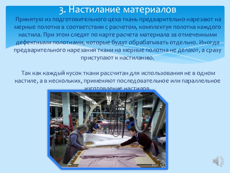 мерные полотна в соответствии с расчетом, комплектуя полотна каждого настила. При этом следят по карте расчета материала за отмеченными дефектными полотнами, которые будут обрабатывать отдельно. Иногда предварительного нарезания ткани на мерные полотна не делают, а сразу приступают к настиланию.